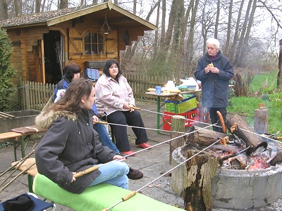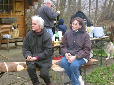 Und so auch an diesem nebligen Fasnachtsdienstag beim Mandolinenverein Auenheim. Claudia hatte die notwendigen Zutaten und Gerätschaften besorgt, als da wären: Spieße für den Speck (aus Holz oder, ganz Nobel, aus V2A-Stahl), Baguette (die Honauer schwören auf Bauernbrot), Speck, Grillwürste, Glühwein, Rotwein, Bier, Schnaps, Likör, Saft, Kaffee und Mineralwasser. Geschirr, Sitzgelegenheiten, die Feuerstelle und jede Menge Brennholz waren in der Gartenhütte vorhanden. Als die ersten so gegen 12 Uhr eintrafen, verbreitete das große Feuer und die Glut schon eine recht angenehme Wärme.