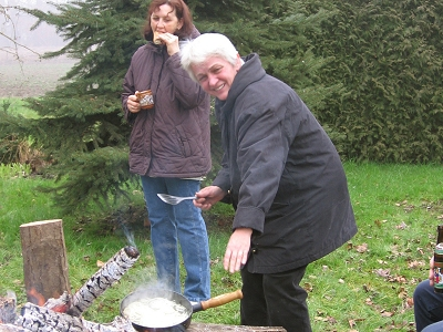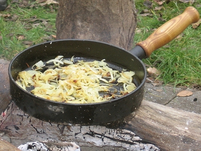 Nach und nach trafen auch die anderen Spieler und Spielerinnen ein und brachten noch verschiedene Kuchen und „Fasnachtsküchle“ mit. Für das leibliche Wohl war also bestens gesorgt. Ab jetzt war dann jeder für die Zubereitung seines Waldspecks selbst verantwortlich: Die Speckscheiben (wer keine Speck mochte nahm eine Grillwurst) auf den Spieß gesteckt und ab über’s Feuer. Elisabeth hatte sogar eine Pfanne und geschnittene Zwiebeln mitgebracht. Diese wurden dann über dem Feuer gedünstet (wie sie uns sagte eine Spezialzutat zum Speck in Leutesheim).