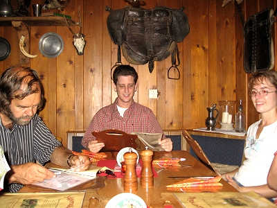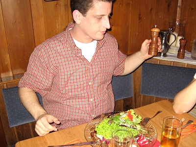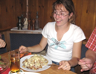 Mittlerweile war es 19 Uhr und kaum saßen wir im „Jägerstüble“ an unserem Tisch, fing es auch schon an zu regnen. Glück gehabt! Nach kurzem Studium der Speisekarte hatte jeder etwas passendes gefunden. Bald darauf wurde aufgetischt: Und wir machten große Augen aufgrund der üppigen Portionen, obwohl wir doch eigentlich, auf anraten von Anne, die „kleine Portion“ des jeweiligen Gerichtes bestellt hatten.