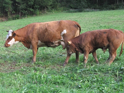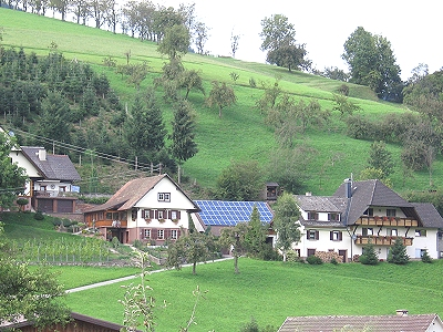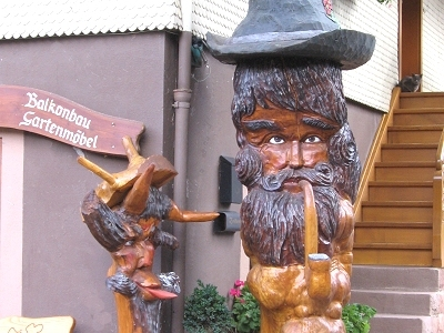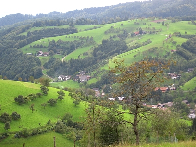 So gestärkt und nach einem prüfenden Blick zum Himmel machten wir uns auf den Weg zum „Jägerstüble“. Und nach dem Motto „wenn Engel reisen lacht die Sonne“, wanderten wir fast zwei Stunden ohne Regen unserem verdienten Abendessen entgegen. Vorbei an Landschaften wie aus dem Märklin-Katalog, jeder Menge Wasser, Holzmännchen, Natur im „van Gogh-Stil“ und glücklichen Kühen. Jean-Philippe wurde im Wald vom Sammeltrieb gepackt und hatte sozusagen im Vorbeigehen am Wegrand eine Handvoll Steinpilze gesammelt, als er die Gaststätte erreichte.