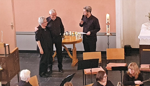 Zudem ehrte der Vorsitzende des Mandolinenvereins Johannes Mellein Marlene Tömmes (Gitarre) und Horst Ross (Mandoline), die gemeinsam seit 65 (!) Jahren im Mandolinenverein spielen.